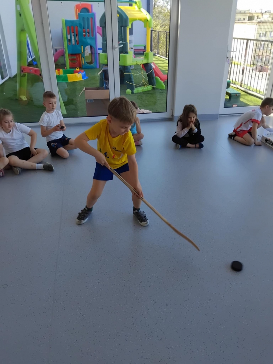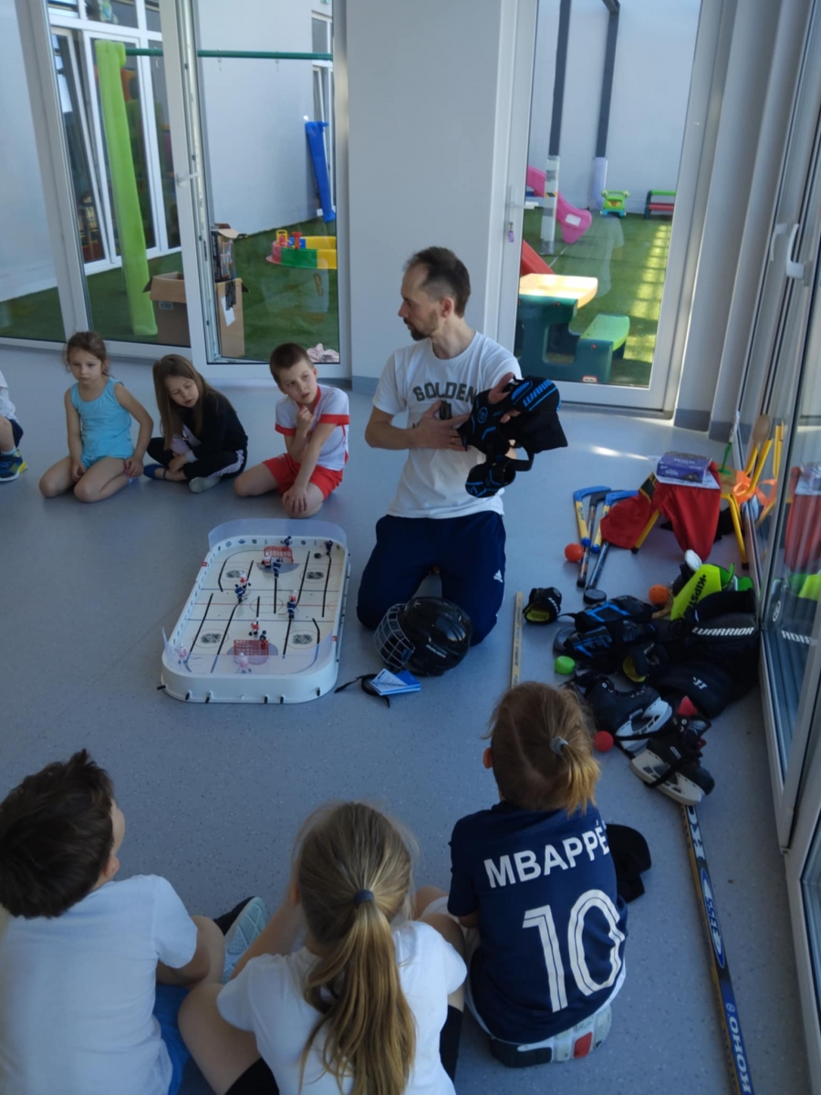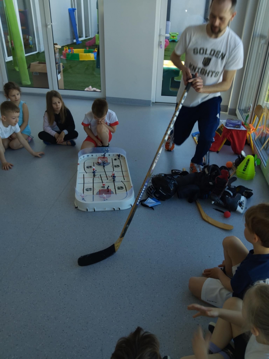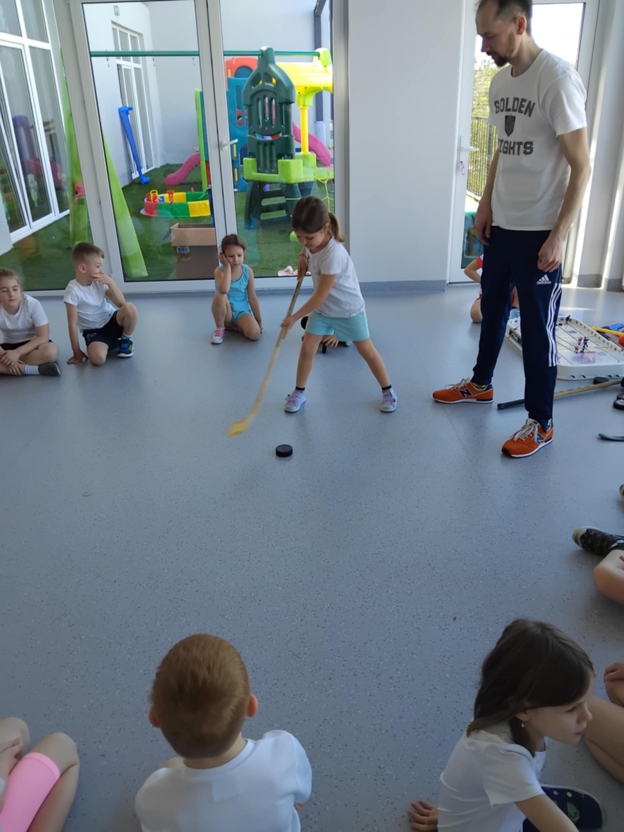 Nasze przedszkole odwiedził tata Mai i Kai i opowiedział nam o swojej największej pasji – o hokeju. Dzieci poznały najważniejsze zasady gry w hokeja, dowiedziały się również jak wygląda sprzęt potrzebny do tej gry oraz miały okazję przymierzyć prawdziwy strój hokeisty. Nie obyło się również bez zajęć sportowych – rozgrzewki oraz ćwiczeń w podawaniu i strzelaniu do bramki.