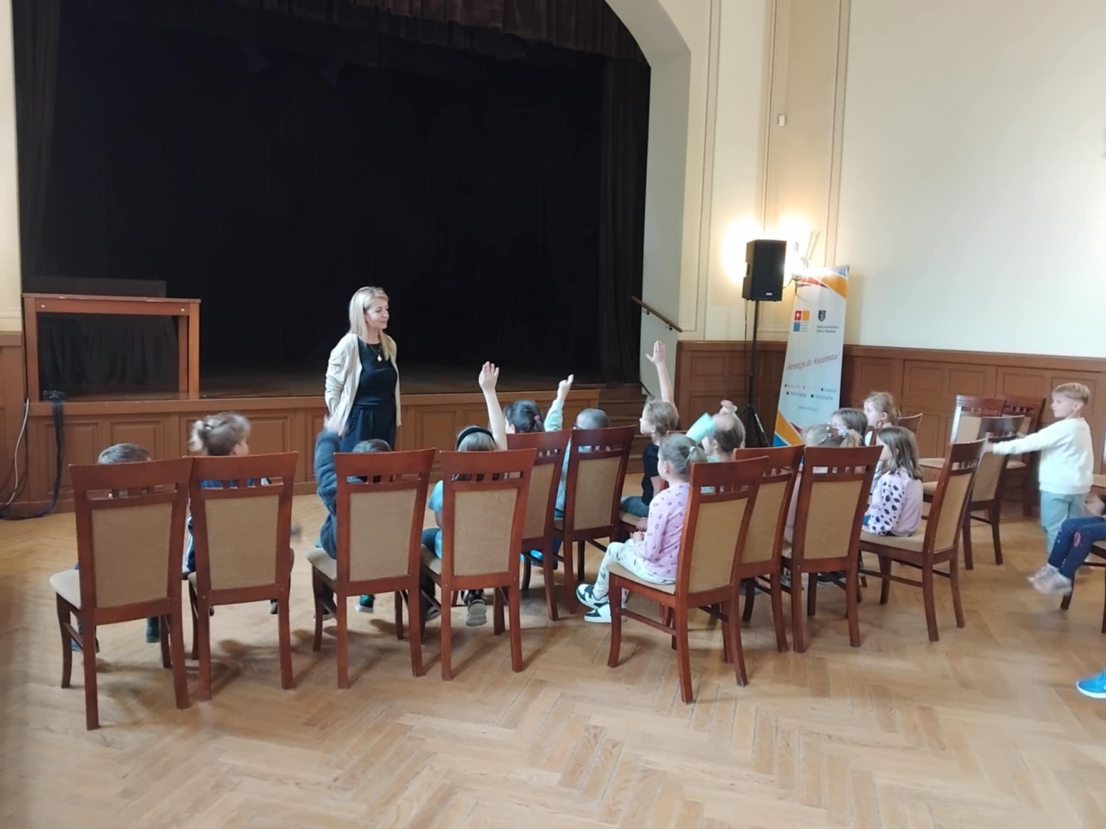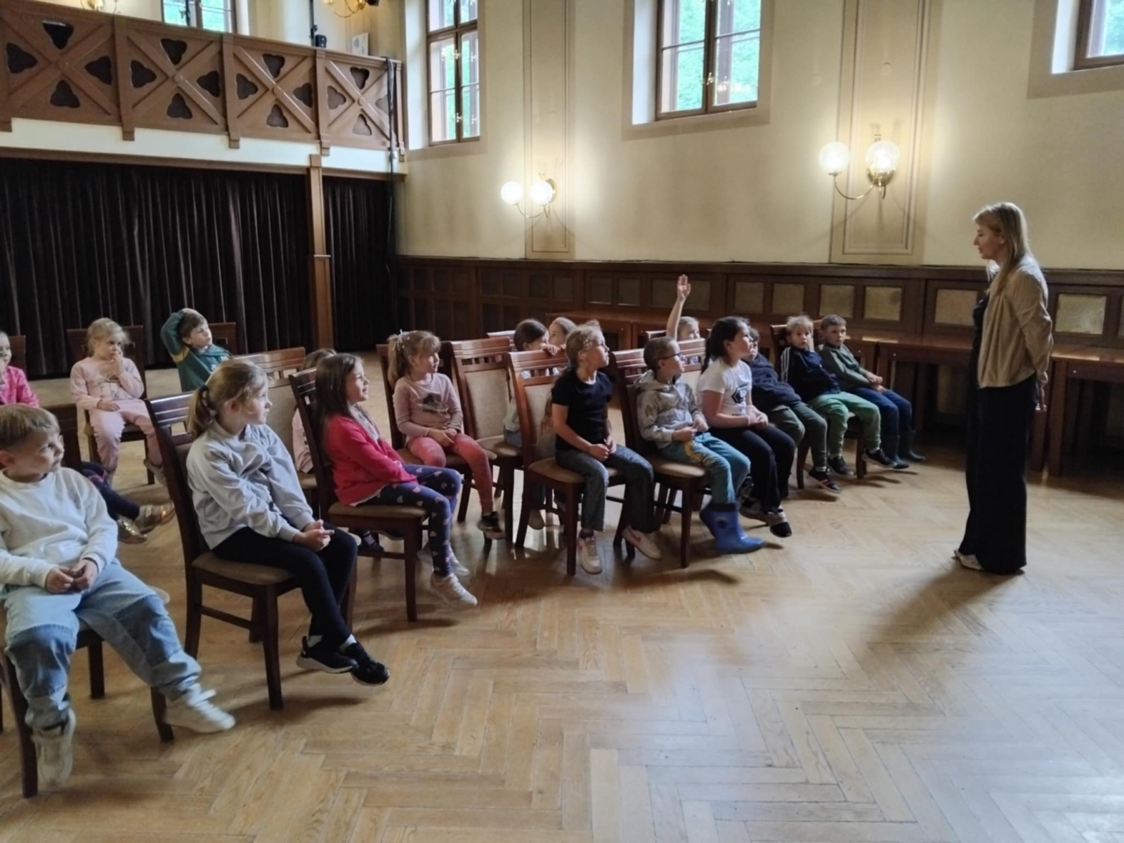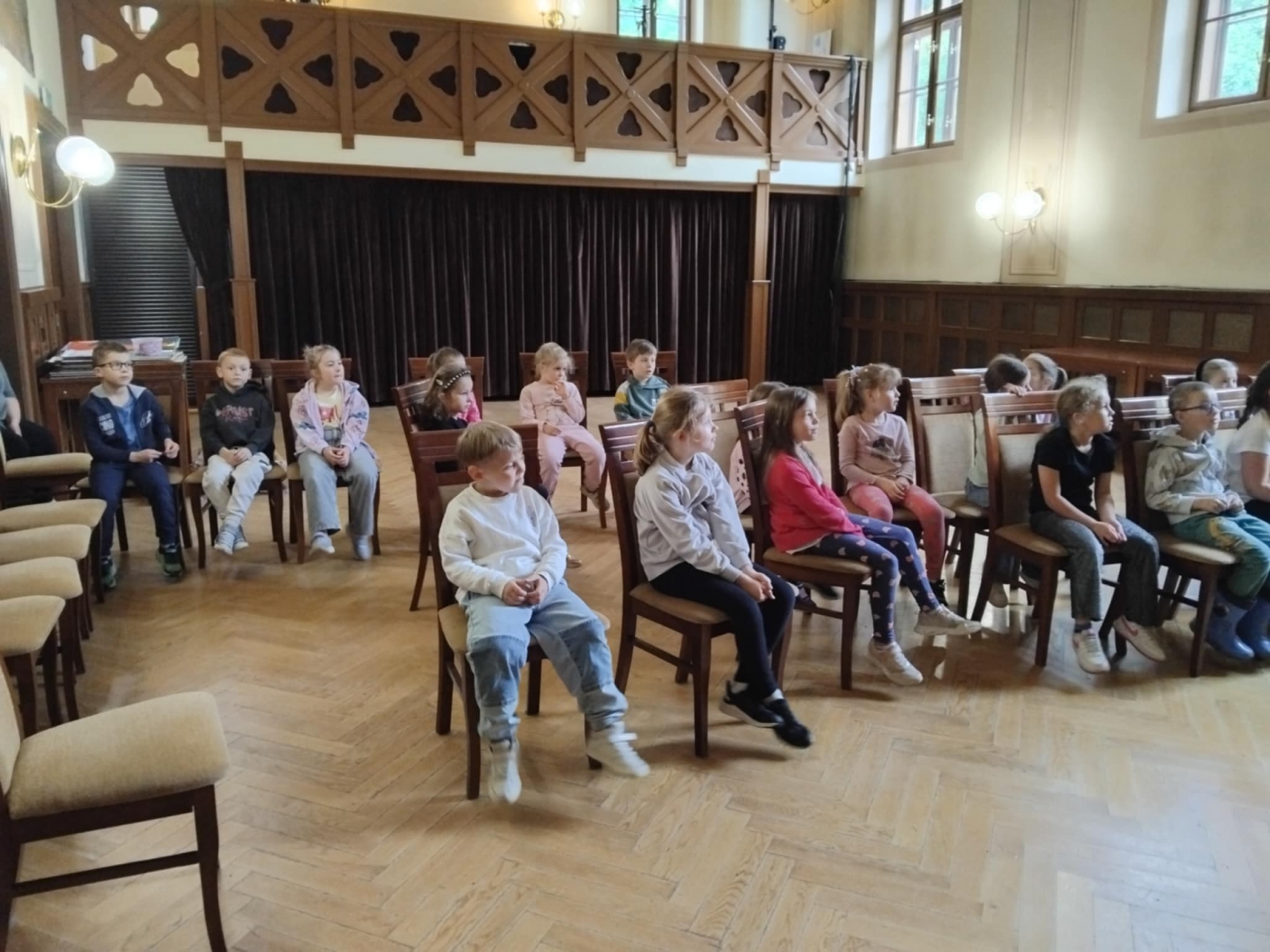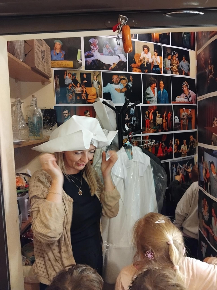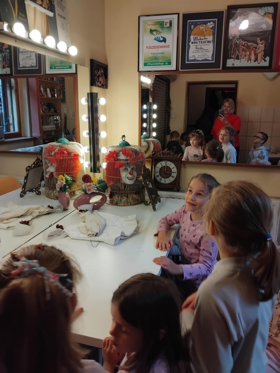 W dniu 23.05.25r. dzieci z grupy III odwiedziły Pałacyk Sokół. Motylki wysłuchały ciekawego wykładu na temat historii Centrum Kultury i Sportu, zwiedziły scenę oraz teatralne zaplecze, a także obejrzały rekwizyty i kostiumy, których używają aktorzy podczas spektakli. Na koniec Starszaki obejrzały wystawę malarską oraz fotograficzną. To była emocjonująca wycieczka, za którą serdecznie dziękujemy Pani Karolinie, mamie Zuzi.